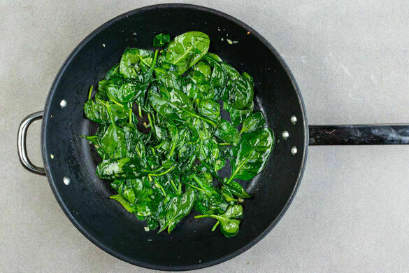 In einer großen Pfanne 1EL Pflanzenöl bei mittlerer Hitze erwärmen. Den Knoblauch und den Spinat in das heiße Öl geben und den Spinat 1–2Min. unter Rühren zusammenfallen lassen. Mit je 1 Prise Salz und Pfeffer würzen und auf einem Teller beiseitestellen.