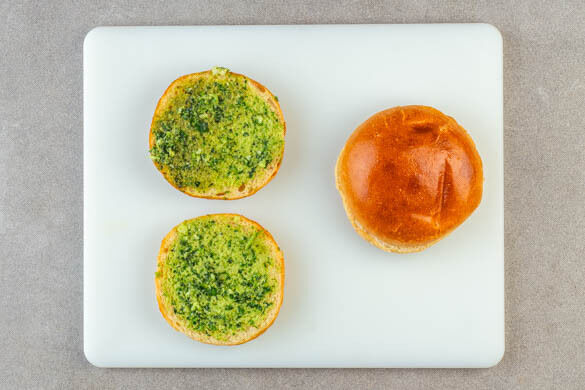 Die Pinienkerne in einer großen Pfanne ohne Zugabe von Fett bei mittlerer Hitze 1–2Min. goldbraun anrösten. Vorsicht, sie können schnell zu dunkel werden. Zum Abkühlen aus der Pfanne nehmen und beiseitestellen. Die Burgerpattys in derselben Pfanne mit 1TL Olivenöl bei mittlerer Hitze auf jeder Seite ca. 2Min. anbraten.