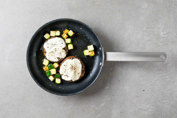 Jedes Patty mit 2 Scheiben Mozzarella belegen und mit Salz und Pfeffer würzen. Die Zucchiniwürfel um die Pattys verteilen und alles 2–3Min. abgedeckt braten. Die Brötchen aufschneiden und 2–3Min. im Ofen aufbacken.