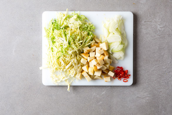 Den Ofen auf 200°C Umluft vorheizen. Die obersten Blätter des Wirsings entfernen und den Rest so dünn wie möglich in Streifen schneiden. Die Peperoni in feine Ringe schneiden. Die Zwiebeln schälen, halbieren und in feine Streifen schneiden. Den Käse in grobe Würfel schneiden.