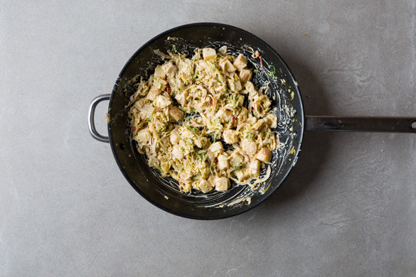 Die Peperoni mit Käsewürfeln und der Créme fraîche unter den Wirsing mischen und mit 1 Prise Zucker, Salz und Pfeffer abschmecken.