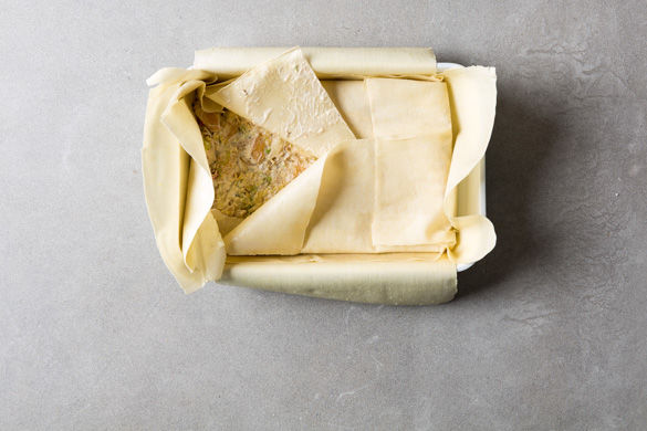 Eine große Auflaufform vorsichtig mit der einer Hälfte des Filoteigs über den Rand hinaus auslegen, dabei die einzelnen Lagen immer wieder mit etwas Olivenöl einstreichen. Dann mit Wirsing-Gemüse füllen und Filoteig über der Füllung einklappen.