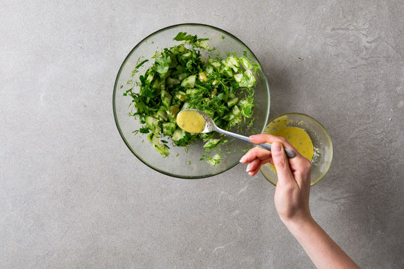 Inzwischen die Gurke ggfs. schälen, längs vierteln und in dünne, schräge Scheiben schneiden. Den Dill und Petersilie samt Stängel fein hacken. Den Senf mit 1-2EL Olivenöl, Salz und Pfeffer verrühren und mit Kräutern und Gurke mischen. Den Salat zu dem Filoauflauf servieren.