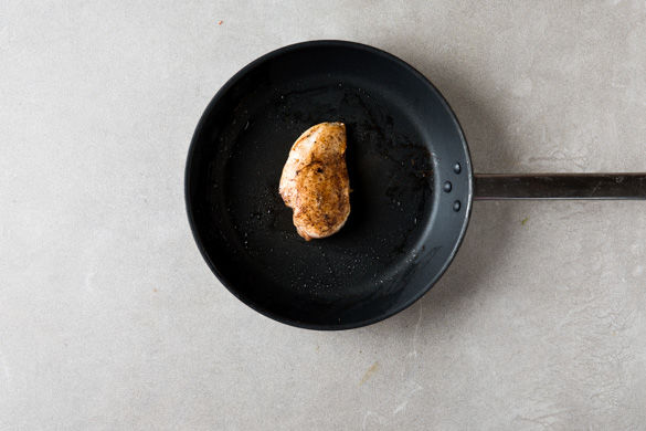 Das Hähnchen samt Öl von jeder Seite ca. 1–2Min. in einer mittelgroßen ofenfesten Pfanne goldbraun anbraten, dann noch ca. 8–10Min. im Ofen fertig garen. In den letzten ca. 3–4Min. die Brötchen mit in den Ofen geben und aufbacken.