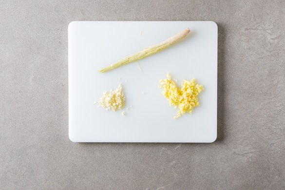 Das Zitronengras mit dem Messerrücken von allen Seiten leicht einklopfen. Den Ingwer und Knoblauch schälen und beides fein hacken. Tipp: Der Ingwer lässt sich am besten mit einem Teelöffel schälen.