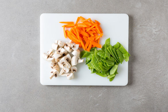 Inzwischen die Kaiserschoten rechts und links vom Strunk befreien und dann nochmals schräg halbieren. Die Pilze mit etwas Küchenkrepp oder einer Bürste ggfs. von Schmutz befreien und dann je nach Größe vierteln oder sechsteln. Die Karotte schälen, längs halbieren und dann in dünne, schräge Scheiben schneiden.
