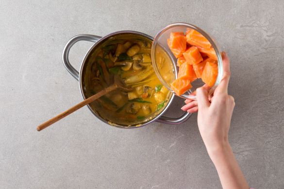 Die Sauce mit Salz und ggfs. Curry Paste abschmecken, die Kaiserschoten, Pilze und Karotten ca. 3-4Min. mitköcheln lassen, dann den Lachs weitere ca. 5-6Min. bei geringer Hitze in der Sauce garen. Vor dem Servieren das Zitronengras heraus nehmen und das Curry mit dem Reis servieren. Tipp: Die restliche Curry Paste im Kühlschrank aufbewahren.