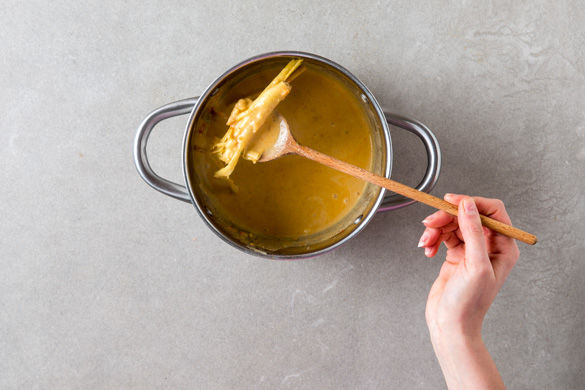 Das Zitronengras mit dem Messerrücken von allen Seiten leicht einklopfen. Den Ingwer und Knoblauch schälen und beides fein hacken. Tipp: Der Ingwer lässt sich am besten mit einem Teelöffel schälen.