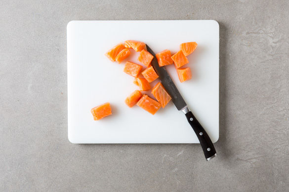 Den Lachs in ca. 2cm große Würfel schneiden.