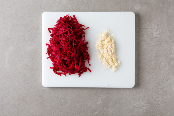 Inzwischen die Rote Beete schälen und mit der groben Seite der Küchenreibe raspeln. Tipp: Da Rote Beete färbt, am besten mit Schürze und Handschuhen arbeiten. Den Meerrettich schälen und fein reiben. Vorsicht! Am besten am offenen Fenster oder unter dem Dunstabzug reiben.