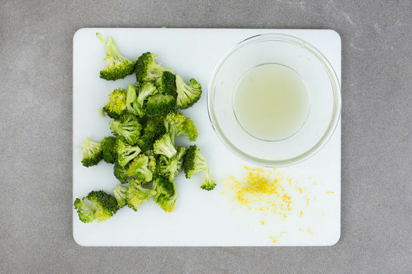 Den Brokkoli in mundgerechte Röschen schneiden, den Strunk ggf. schälen und in ca. 1cm große Würfel schneiden. Die Zitronenschale abreiben, dann die Zitrone halbieren und auspressen.