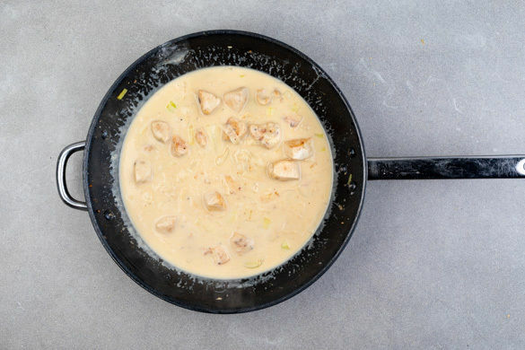 Das Fleisch in einer großen Pfanne mit 2EL Olivenöl bei starker Hitze 1–2Min. rundum scharf anbraten. Die Zwiebeln und den Knoblauch hinzugeben und 1–2Min. mitbraten. Die Temperatur reduzieren und das Fleisch mit 1–2EL Mehl bestäuben. Mit ca. 350ml Pastawasser ablöschen und die Crème fraîche und das Brühgewürz unterrühren.