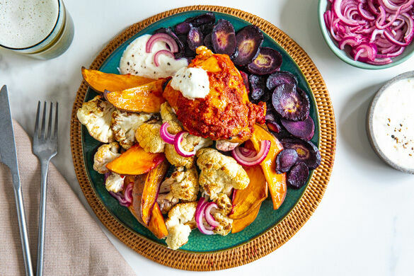 Chili-Fans aufgepasst! Unter der Losung „Peri-Peri“ könnt ihr heute hemmungslos eurer Schärfelust frönen und die Hähnchenoberkeulen mit einer feurigen Mischung aus Cajun-Gewürzen und Harissapaste bestreichen, bevor sie in den Ofen wandern. Zur Abkühlung gibt es milden gebackenen Blumenkohl, Süßkartoffelspalten und einen zitronigen Knoblauchjoghurt. Ihr habt es Euch verdient!