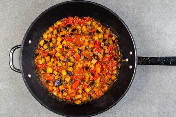 Den Speck in einer mittelgroßen Pfanne bei mittlerer Hitze 3–5Min. rundum anbraten, dann beiseitestellen. Die Auberginen und die Tomaten in die Pfanne geben und mit 1EL Olivenöl bei mittlerer Hitze in ca. 8Min. weich braten. Den Knoblauch hinzufügen und ca. 1Min. mitbraten, dann das Gemüse mit 200ml Wasser ablöschen und ca. 5Min. köcheln lassen.