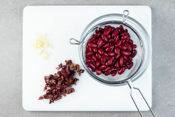 Die Bohnen in einem Sieb mit kaltem Wasser abspülen und abtropfen lassen. Die Oliven grob schneiden. Den Knoblauch schälen und fein würfeln.