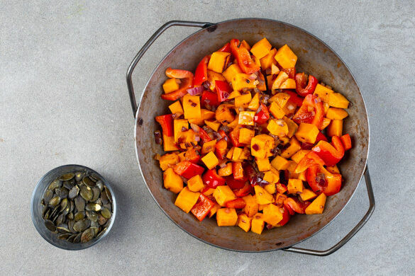 Die Kürbiskerne in einer großen Pfanne ohne Zugabe von Fett bei mittlerer Hitze 2–4Min. anrösten, bis sie knistern und goldbraun sind. Zum Abkühlen aus der Pfanne nehmen. Die Zwiebeln, die Paprika und die Süßkartoffeln in der Pfanne mit 2EL Olivenöl bei mittlerer bis starker Hitze 8–10Min. anbraten. Mit Salz, Pfeffer und 1 Prise Zucker abschmecken.