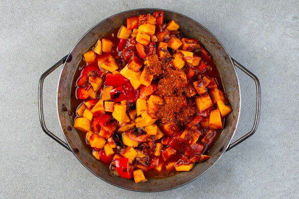 Den Knoblauch und 1TL Gewürzmischung unter das Gemüse rühren und ca. 1Min. mitbraten. Mit den passierten Tomaten und 200ml Wasser ablöschen. Die Flüssigkeit einmal aufkochen lassen, dann das Gemüse bei niedriger Hitze ca. 10Min. sanft köcheln lassen, bis das Wasser verdampft ist und die Süßkartoffeln gar sind.