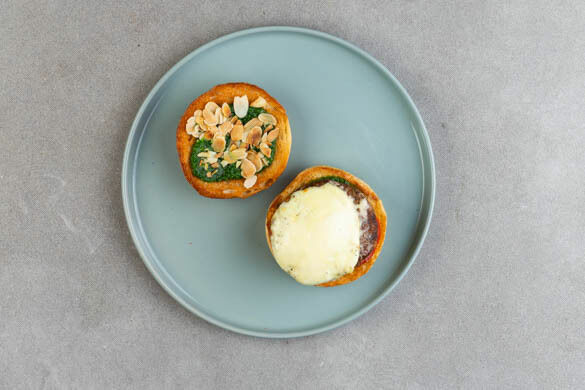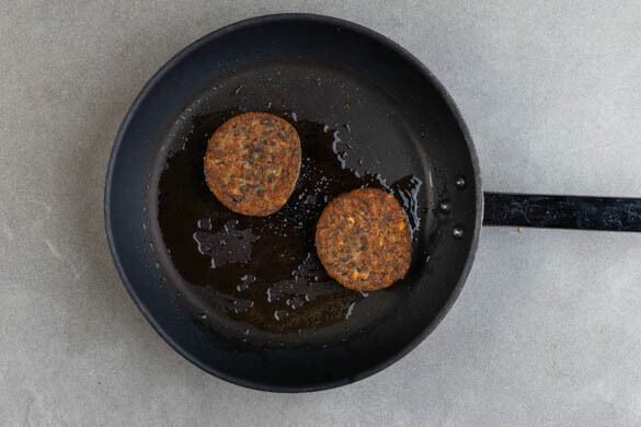 Die Mandelblättchen in einer großen Pfanne ohne Zugabe von Fett bei mittlerer Hitze 1–2Min. goldbraun anrösten. Vorsicht, sie können schnell zu dunkel werden. Zum Abkühlen aus der Pfanne nehmen und beiseitestellen. Die Burgerpattys in derselben Pfanne mit 1TL Olivenöl bei mittlerer Hitze auf jeder Seite ca. 2Min. anbraten.