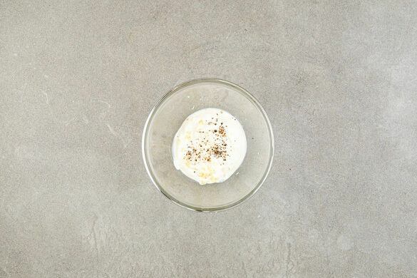 Den Knoblauch schälen und sehr fein würfeln oder durch eine Knoblauchpresse drücken. Die Crème fraîche mit dem Knoblauch sowie je 1 kräftigen Prise Salz und Pfeffer verrühren.