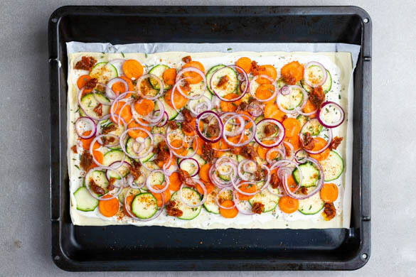 Die Teige mit dem Papier nach unten auf zwei Backblechen ausrollen und gleichmäßig mit der Crème fraîche bestreichen. Die Zucchini, die Karotten, die Zwiebeln und die getrockneten Tomaten auf den Teigen verteilen. Jeweils mit der ½ des Rosmarins, der ½ der Gewürzmischung sowie 1 Prise Salz bestreuen und mit je 2TL Olivenöl beträufeln.