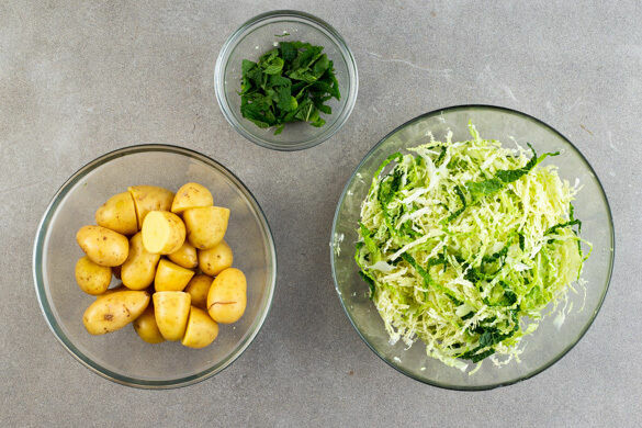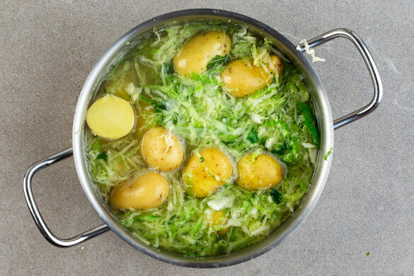 Die Kartoffeln und die Minze in das kochende Wasser geben und ca. 4Min. kochen lassen. Dann den Wirsing dazugeben und das Gemüse 8–10Min. weiterköcheln, bis die Kartoffeln und der Wirsing gar sind.