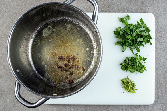 Die Sardellen fein schneiden. Die Basilikum- und Oreganoblätter von den Stängeln zupfen und separat grob schneiden, die Stängel fein schneiden. Die Sardellen in einem großen Topf mit 3EL Butter bei niedriger Hitze in 2–3Min. schmelzen lassen, ohne die Butter zu bräunen.