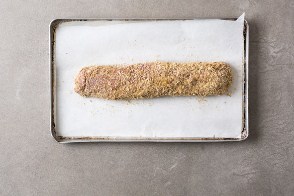 Das Panko mit Gewürz in einem großen Teller vermischen. Den Senf mit 1EL Öl verrühren. Das Fleisch trockentupfen und mit Salz und Pfeffer würzen, dann rundum dünn mit der Senfmischung bestreichen und in den Pankobröseln wenden, bis alles bedeckt ist. Das Fleisch auf ein mit Backpapier belegtes Blech legen und ca. 25Min. im Backofen garen.