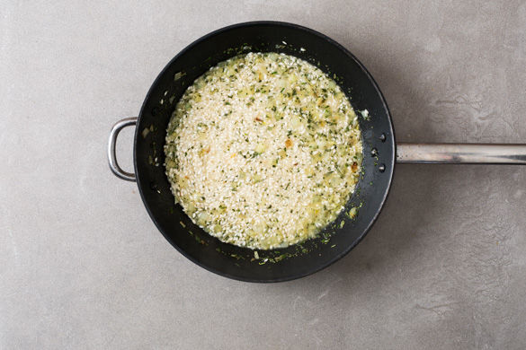 Inzwischen 2L Wasser im Wasserkocher zum Kochen bringen und anschließend 1,5 Brühwürfel im heißen Wasser auflösen. Eine große Pfanne mit 1-2EL Olivenöl mittelhoch erhitzen und die Hälfte der Zwiebeln ca. 1-2Min. in der Pfanne anbraten, dann Reis dazugeben und weitere ca. 1-2Min. in der Pfanne schwenken.