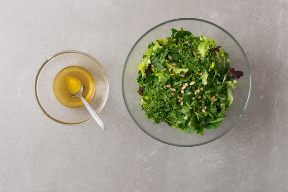 Zum Schluss die Pinienkerne in einer kleinen Pfanne ohne Fett bei mittlerer Hitze goldgelb rösten. Den Kerbel und Petersilie ohne Stängel grob hacken und mit dem Salat vermengen. Aus dem Himbeeressig, 1TL Salz, Pfeffer, 3EL Olivenöl und 1EL Wasser ein Dressing rühren, kurz vor dem Servieren den Salat mit den Pinienkernen und dem Dressing vermengen.