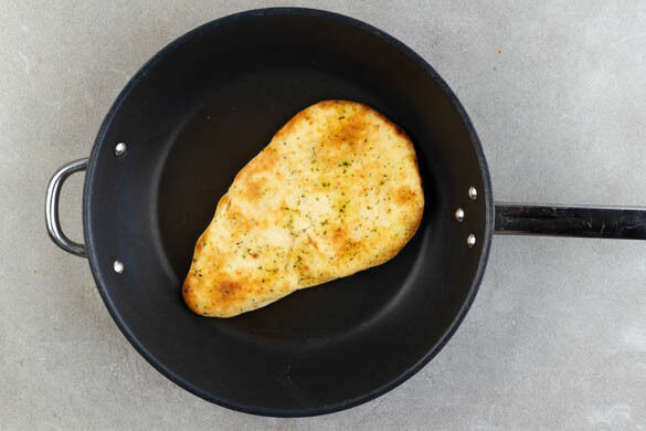 Die Naan-Brote mit ein paar Spritzern Wasser benetzen und nacheinander in einer großen Pfanne bei mittlerer Hitze jeweils ca. 3Min. rösten, dabei gelegentlich wenden.