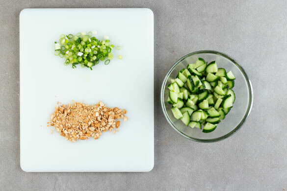 Die Gurke längs vierteln und in ca. 1cm kleine Stücke schneiden. Mit 1TL Zucker, 1 kräftigen Prise Salz und 1EL Essig vermengen. Ein Loch in die Tüte mit den Cashews stechen und die Cashews in der Tüte mit dem Boden einer Pfanne in kleine Stücke brechen. Die Lauchzwiebel in feine Ringe schneiden.