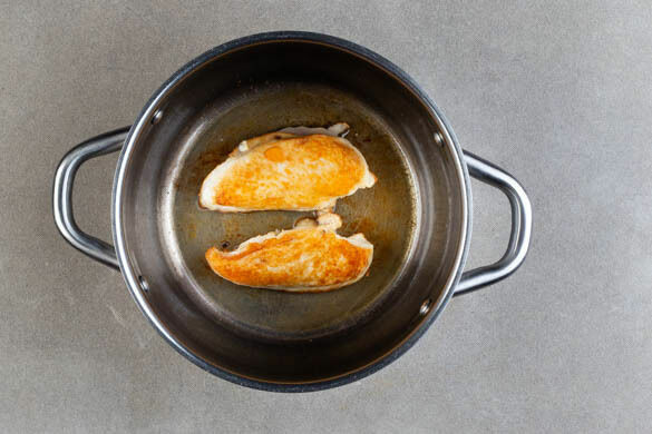 Das Fleisch trocken tupfen und in einem mittelgroßen Topf mit 1EL Pflanzenöl bei mittlerer bis starker Hitze ca. 3Min. auf jeder Seite anbraten, bis das Fleisch noch nicht gar, aber von außen gebräunt ist. Aus dem Topf nehmen und beiseitestellen, den Topf samt Bratenfett aufbewahren.