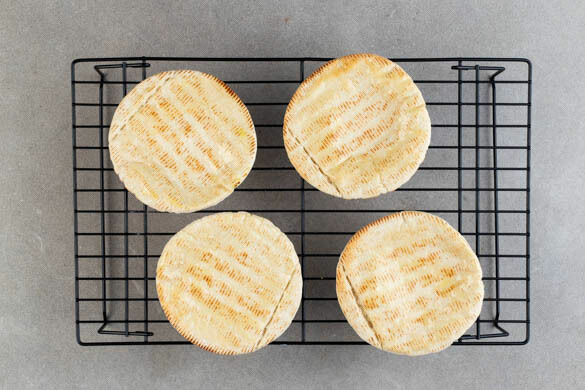 Die Pitabrote mit etwas Wasser besprenkeln und 4–6Min. im Ofen erwärmen, bis sie leicht gebräunt sind. Mit der zimmerwarmen Margarine bestreichen.