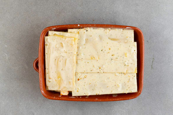 Die Tomaten grob würfeln. Den Boden einer mittelgroßen Auflaufform mit ¼ der Sauce bedecken.