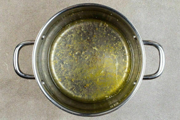 Den Knoblauch schälen und fein würfeln, anschließend in einem mittelgroßen Topf mit 1EL Pflanzenöl bei mittlerer Hitze ca. 1Min. anbraten, dabei gelegentlich umrühren. 600ml Wasser mit ½TL Salz zugeben und aufkochen.