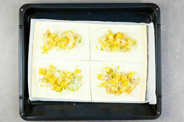 Die Teigrechtecke gleichmäßig mit der Frischkäsecreme bestreichen, dabei einen Rand von ca. 0,5cm aussparen. Die Apfel- und die Ananasstücke darauf verteilen und die Kokosraspel darüberstreuen. Die Ananas-Apfel-Törtchen 20–23Min. im Ofen goldbraun backen. Nach der Hälfte der Zeit die Position der Bleche tauschen.