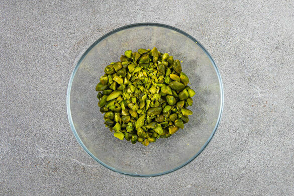 Die Pistazien grob hacken. Tipp: Wer möchte, kann die Pistazien kurz anrösten. Das Kompott vom Herd nehmen, mit 1 Prise Salz verfeinern und 1EL Butter unterrühren. Die Crêpes auf Teller verteilen, nach Belieben aufrollen oder falten, mit dem Kompott und der Schlagsahne anrichten und mit den Pistazien garniert servieren.