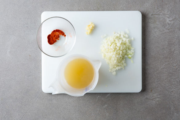 Den Umluftofen auf 220°C vorheizen. Die Zwiebeln und den Knoblauch schälen, halbieren und beides in feine Würfel schneiden. Den Safran mit dem Messergriff oder Mörser und Stößel zerkleinern und mit der Hälfte des Paprikagewürz mischen. Die Brühwürfel in 500ml heißem Wasser auflösen.