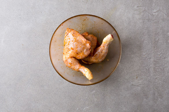 Die Hähnchenkeulen nun nach Geschmack mit dem restlichen Paprikapulver und 2-3EL Olivenöl, Salz und Pfeffer würzen.