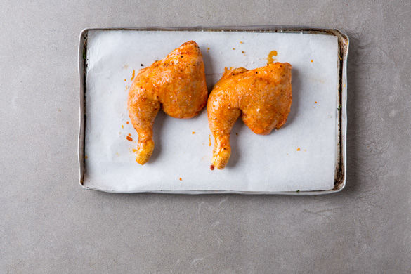 Die Keulen dann auf ein mit Backpapier ausgelegtes Backblech geben und für ca. 25-30Min. im Ofen knusprig garen.