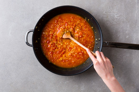 Inzwischen die Zwiebeln und Knoblauch in einer großen Pfanne mit 1-2EL Olivenöl ca. 1-2Min. farblos anschwitzen, Reis dazugeben und weitere ca. 1-2Min. mitbraten. Mit Safran-Paprika-Gewürz bestäuben und mit Tomaten und Brühe ablöschen. Für ca. 20-25Min. leicht köcheln lassen, bis der Reis bissfest ist. Gelegentlich umrühren, ggfs. etwas Wasser nachfüllen.