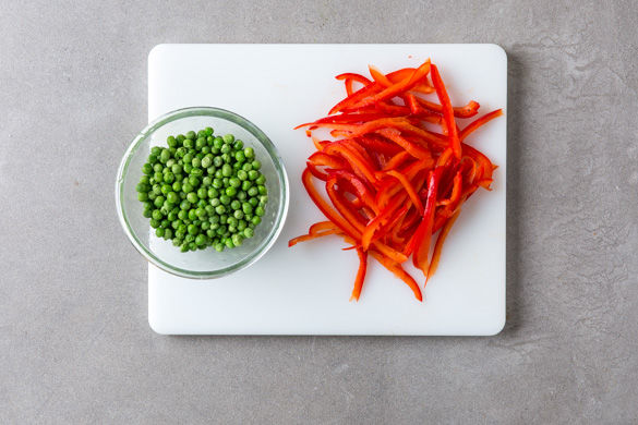 In der Zwischenzeit die Paprika vierteln, entkernen, nochmal halbieren und in dünne Streifen schneiden. Die Erbsen aus der Schale lösen.