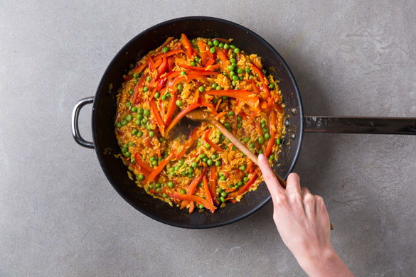 Angelehnt an Paella, dem Nationalgericht der spanischen Ostküste, bereitest du dir heute für dein Abendessen eine mediterran-gewürzte Reispfanne zu, die mit frischen Erbsen, Paprika und Safran abgeschmeckt wird. Dazu gibt es krosse, im Ofen gebackene Hähnchenkeulen! Guten Appetit!