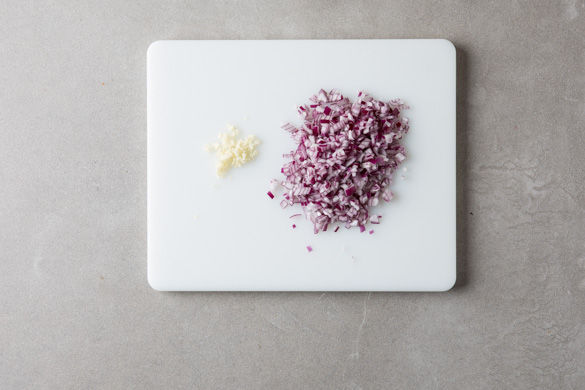 In einem mittelgroßen Topf ausreichend gesalzenes Wasser aufsetzen. Den Ofen auf 220°C Umluft vorheizen. Die Zwiebel und Knoblauch schälen, halbieren und in feine Würfel schneiden.