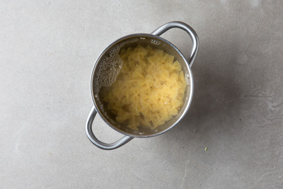 Sobald das Wasser kocht, die Pasta ca. 4-6Min. sehr bissfest abkochen und dann abgießen. Sie sollten noch nicht durch sein.