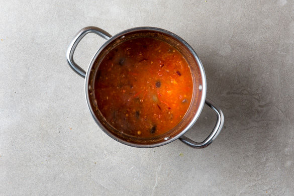 Nun die Hälfte der Zwiebeln mit Knoblauch, Oliven und Tomaten in einem mittleren Topf in 1-2EL Olivenöl ca. 1-2Min. anschwitzen und mit den gehackten Tomaten und 100-150ml Wasser ablöschen. Den Brühwürfel dazugeben und ca. 5-8Min. köcheln lassen, mit Salz und Pfeffer abschmecken. Tipp: Wer mag, kann die Oliven auch nach Geschmack zum Schluss dazu servieren.