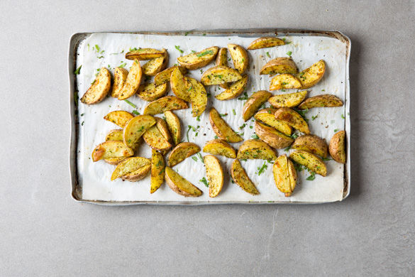 Währenddessen die Kartoffeln mit der Schale in ca. 1–2cm dicke Spalten schneiden und mit 1–2EL Olivenöl und der Gewürzmischung nach Geschmack vermengen. Die Kartoffeln auf einem mit Backpapier ausgelegten Backblech verteilen und und im Ofen ca. 20–25Min. backen, bis sie knusprig sind.