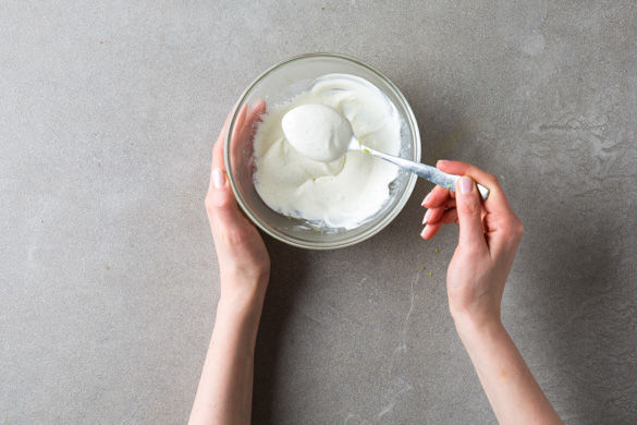 Inzwischen den Joghurt mit 1EL Olivenöl und 1-2TL Limettensaft glatt rühren, mit Salz und Pfeffer abschmecken.