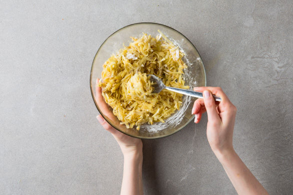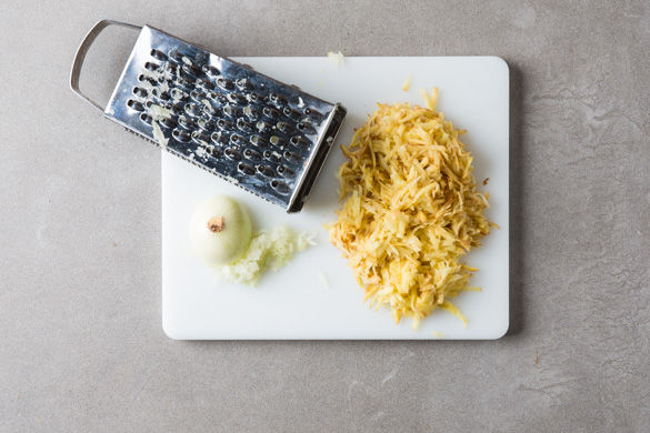 Den Ofen auf 200°C Ober-/Unterhitze vorheizen. Wer mag, kann die Kartoffeln schälen und dann mit der groben Seite der Küchenreibe raspeln, die überschüssige Flüssigkeit gut auswringen. Die Zwiebel schälen, ein Ende entfernen und mit dem anderen Ende in der Hand ebenfalls raspeln und auswringen.