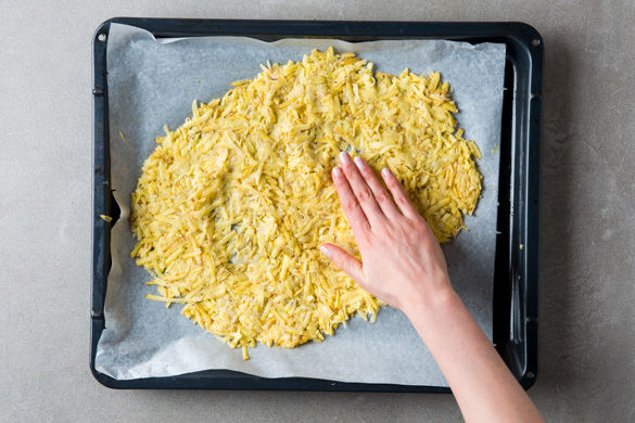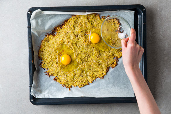 Nun ein tiefes Backblech je nach Vorliebe mit Backpapier auslegen oder mit etwas Olivenöl einreiben. Die Rösti-Mischung gleichmäßig und dünn darauf verteilen, mit den Fingern 2 kleine Kuhlen formen und dann für ca. 25-30Min. im Ofen goldbraun und knusprig rösten. Tipp: Den Ofen ab und zu kurz aufmachen, damit die Feuchtigkeit entweichen kann.